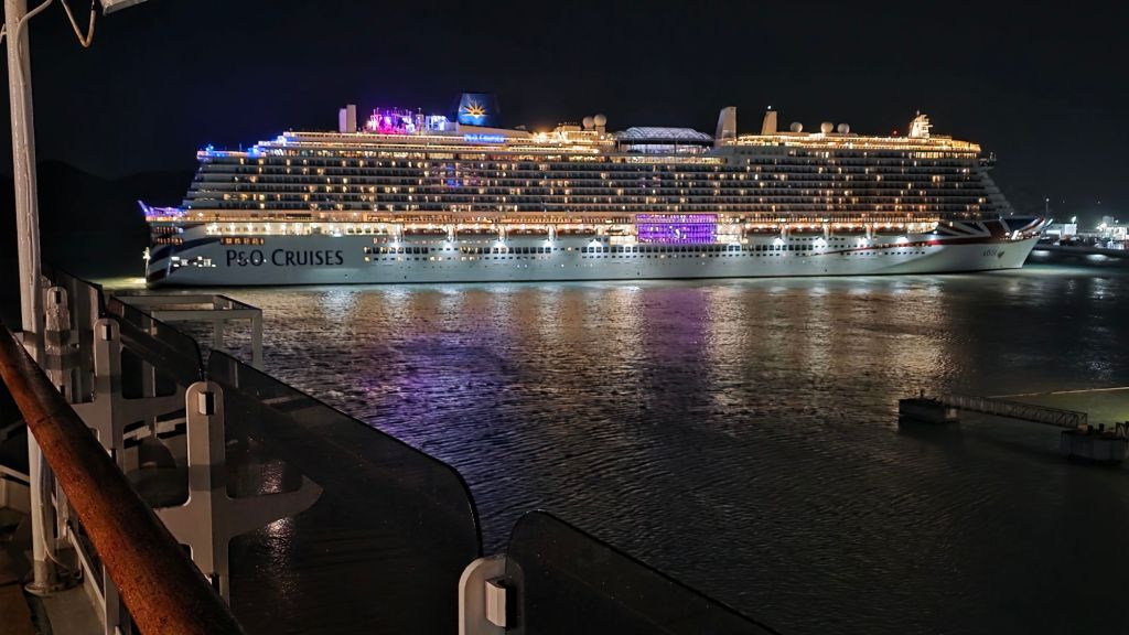 While I may be strongly loyal to Cunard it does not stop me from being fascinated by other ships. To see both Iona and side by side was amazing and rare. I could feel the onset of evening. The lights of P&O’s Iona were beginning to shine like faded stars which seemed to be increasing in brightness..