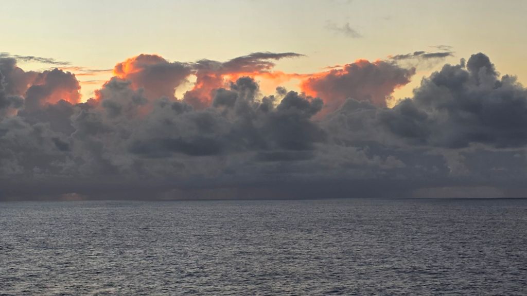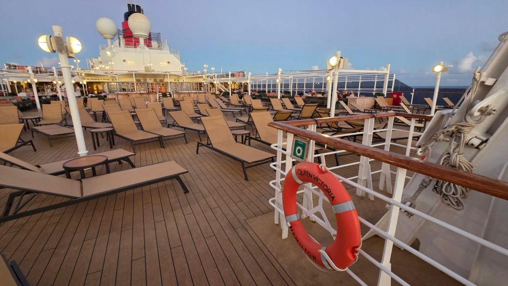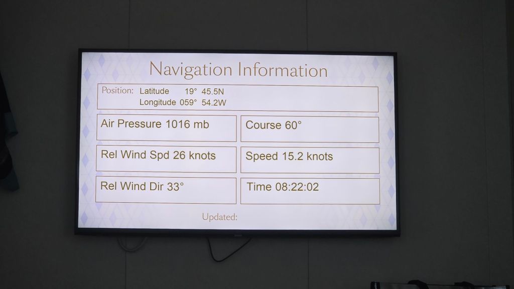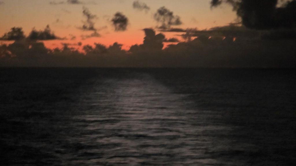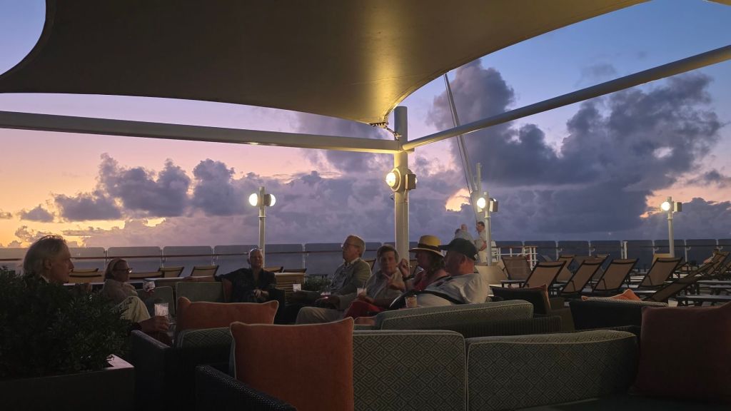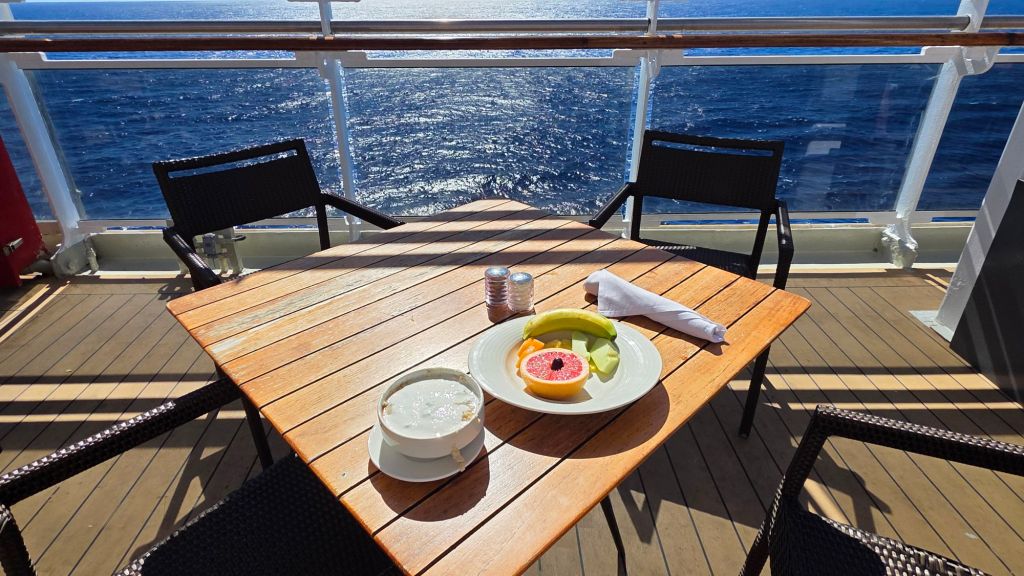 Decent weather is predicted for the next three days or so. We are trundling along forever north east at around 15.1 knots. along historic transatlantic trade routes connecting the Americas with Europe. Of course, there’s plenty to occupy one on board. Dancing. lectures and a daily movie are some of the indoor choices available. Also numerous quizzes around the ship. But for these remaining few days in tropical waters, I will probably take a refresher on soaking up the sun. Will I ever take breakfast on my patio during the summer?