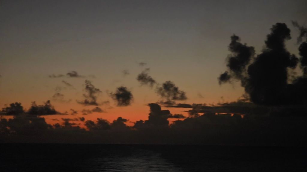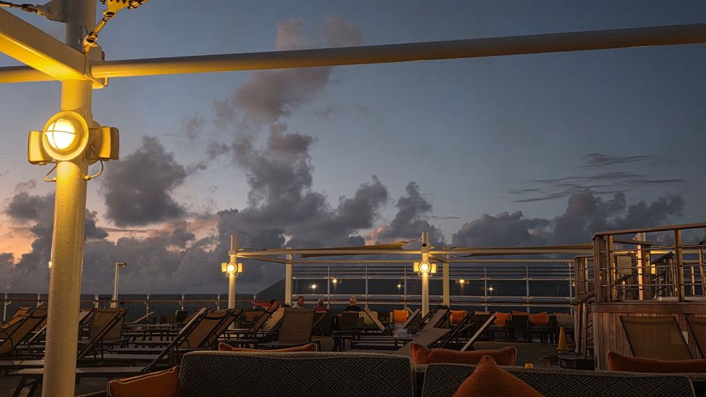 So, I didn’t sit in the sun forever this afternoon. I was determined, despite the welcome continued heat to walk around Deck 3. Ye gods! I was slow! Nevertheless, I kept moving, kept breathing magnificent sea air. It is 6pm now and the sun setting behind grey clouds against a salmon and turquoise sky creates a temporary wonderful and dramatic backdrop, ever darkening to a nocturnal blackness.