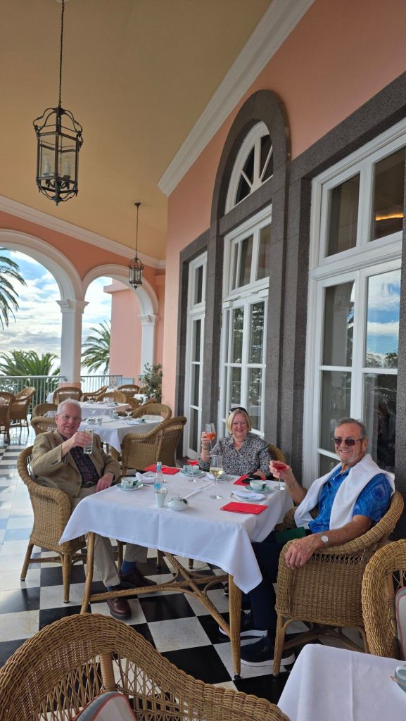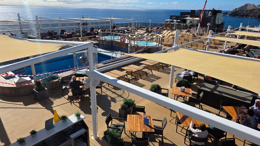 Nowhere is there blue sky this morning as I finish breakfast looking out of the starboard side floor to ceiling windows of the Lido. When I found a table carrying precariously a bowl of oatmeal. banana, honey and plain yoghurt, the place was full. No al fresco coffee this morning trying to shelter from a blazing sun then! However, I am enjoying from the vantage point of a window seat a different grey frothy Atlantic Ocean. I assume we are heading towards the African coast in search of (or towards) the least turbulent route home without compromising any schedules.