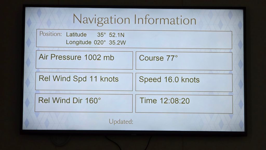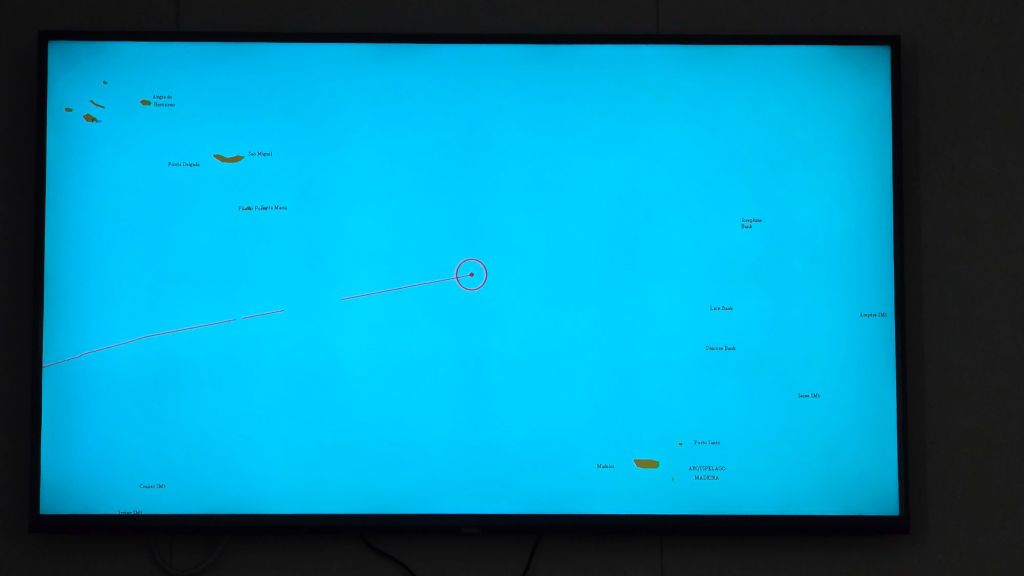 The Captain’s noon-day broadcast more or less confirmed what we were told yesterday. As you will see from the charts below, we continue in a predominantly easterly direction with Madeira c500 miles south east and the Azores a similar distance northwest.